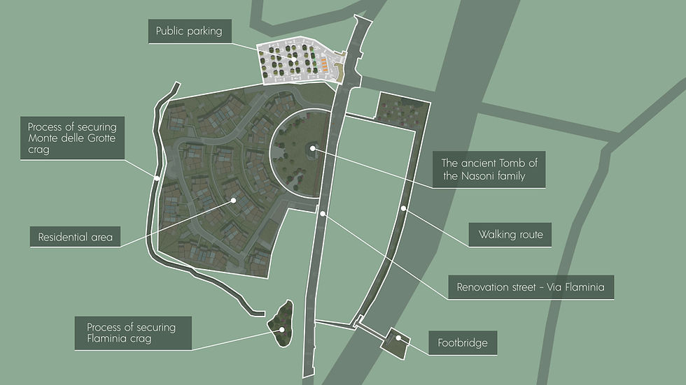 Il progetto prevede la trasformazione di un'area di oltre 47.000 metri quadrati lungo la via Flaminia, precedentemente occupata da una cava ottocentesca e da un vecchio mulino, in un nuovo quartiere residenziale con oltre 360 abitazioni e ampie aree verdi.